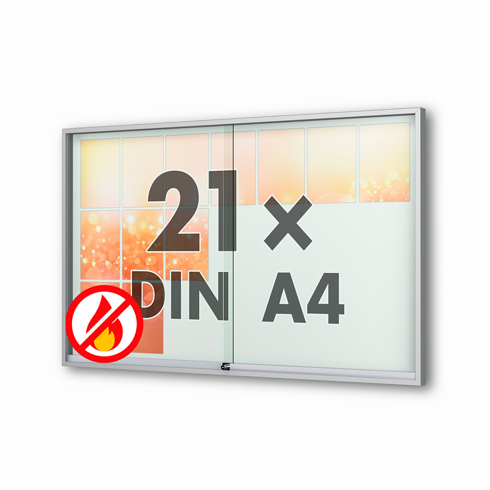 Schaukasten Fortis - eckig - mit Schiebetüren -210 mm Gehäusetiefe, rollengelagerte Schiebetüren, höchster Brandschutz (A1) Größe - 18 × DIN A4 • 1370 × 1010 mmSichtfläche: 1330 x 950 mm Öffnung - rollengelagerte SchiebetürenVerglasung - Einscheiben-Sicherheitsglas / ESGOberfläche - Eloxierung in matt-silber (E6/EV1)Beleuchtung - ohne BeleuchtungSchließung - Sicherheitsschlösser mit je 2 SchlüsselnRückwand - weiße, magnethaftende Rückwand inkl. 10 Magnete
