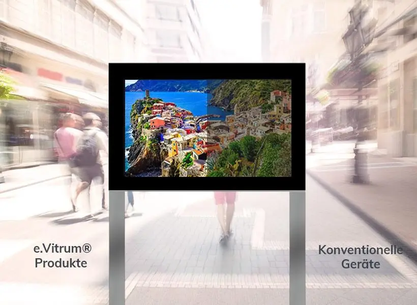 e.Vitrum® Monitorvitrine Outdoor - einseitig Größe: 861 x 2245 x 205 mm B x H x TOberfläche: E2-C31 NIROXDisplay 55" LCD-Panel, Full HD 1080 x 1920 Pixel, 24/7 BetriebHelligkeit 2500 cd/m², inkl. HelligkeitssensorSichtmaß 681 x 1210 mmAbmessung Flügel 861 x 1445 mmÖffnungsart KlappflügelÖffnungswinkel 70°Verschluß Sockel Profilzylinder frontseitig, DIN LSVerschluß Display 6-Kant Getriebeverriegelung mit ServiceschlüsselVerglasung Chemisch entspiegeltes 9,14mm VSG Sicherheitsglasmit IR und UV Filter im Scheibenzwischenraum. DieSchutzscheibe wird im zertifizierten Dow Corning Verfahren dauerhaft aufgebrachtPassepartout Keramisch bedruckt, RAL 9005, SchwarzAusführung Hochwertige Aluminiumkonstruktion aus EN AW 6060.Blendrahmen mit Kantenradius R 3 und Flügelrahmen in flächenbündiger KonstruktionStandbeine/ Aufbau Innen liegende Stahlkonstruktion mit Fußplatten, 150 mm unter OKFFRückseite Geschlossen mit einem AluminiumblechKlimatechnik Integrierte Lüfter-Technik sowie Temperatur gesteuertesHeizsystem. Temperaturbereich - 33° C bis + 40° CSchutzklasse IP 65 Gehäuse | IP 54 KlimabereichZubehör 2 Stk. Steckdosen, Befestigungsmaterial, Sicherungselemente,Potentialausgleich, Outdoor-Kabeleinführung