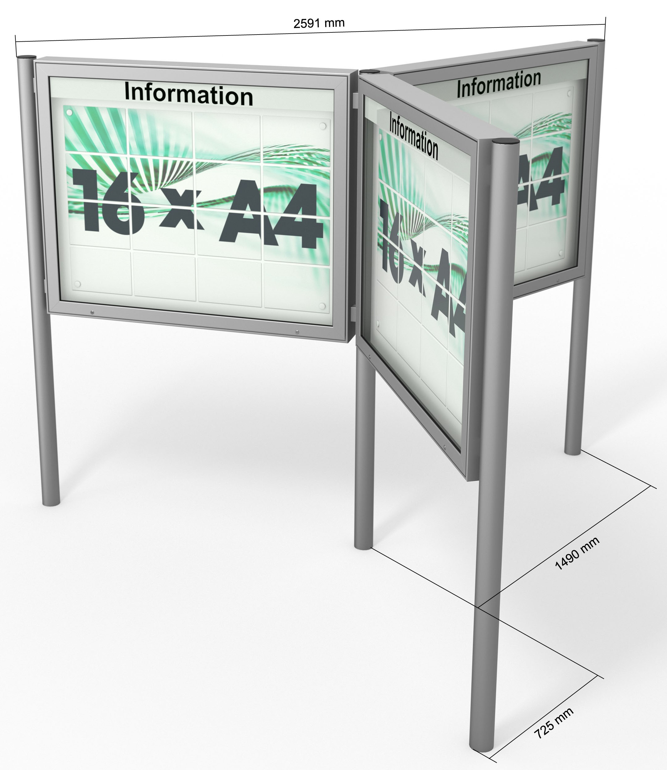 | Merkmale Schaukasten: | Klappflügel, LED-Beleuchtung, abschliessbar, magnetisch, mit Pfosten, mit Standbeinen, wetterfest |
